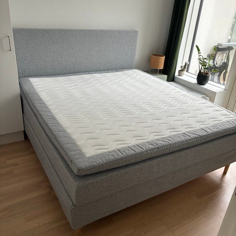 DUX Nordic seng. Sengen består af en polstret boxmadras med gråt tekstil og tilhørende topmadras. Madrassen er mærket med fastheden "medium". Sengen har en neutral farve, der passer ind i de fleste soveværelser.