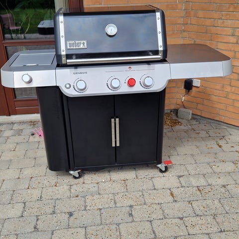 Grillen er fra 2021/2022 og har stået i vores sommerhus. med Den har 4 brændere. Modellen er med digitalt display, der viser temperatur og kan styres via Webers egen App. Grillen har låg i sort emalje og kabinet i sort med dobbeltlåger. Arbejdsflader og frontpanel er i rustfrit stål.