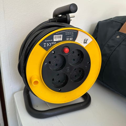 25 Meter CEE kabeltromle med blå stikprop og stikdåse. Kabeltromlen har kraftig gummikabel monteret på en trekantet holder i plast. I den ene ende er der CEE hanstikprop, og i den anden ende CEE hunstikdåse med låg samt ekstra løs hunstikdåse. Egnet til tilslutning af udstyr med CEE-stik, f.eks. camping, båd eller byggeplads, hvor der anvendes blå CEE stikforbindelser.