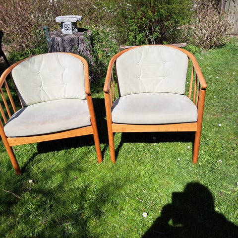 Et par pindestole / lænestole af mørkbejdset træ, løse hynder med lyseblå alcantara. Fremstår med lidt brugsspor på hynder. Sh 45 cm. Udført hos Stouby. Prisen er for parret