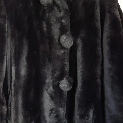 NYRENSET. Ultra Soft. Veludført. Dyrevenlig. *Rummelig Nordisk Størrelse*. Ligner en ægte pels, blød som babysæl. 1 stk Lun varm pæn sort 3/4 lang Jakkefrakke m. nuttede pon-pon-Pjerrotknapper som dekor pynt, let at lukke praktisk hægteluk bag. Dejlig stor 'putte-hætte'/ hætte i blød teddybear m. afslappet rummelig pasform. Loose-fit.