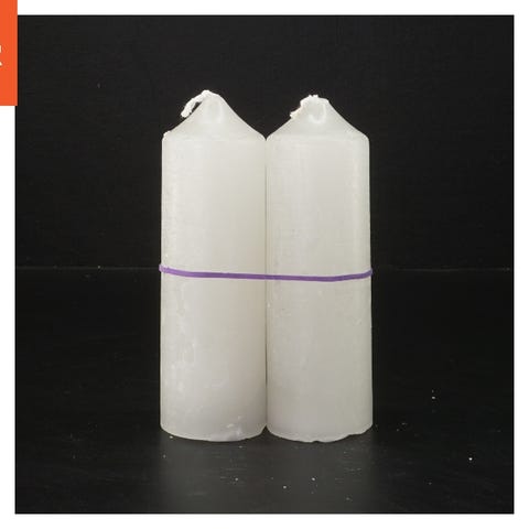 Et sæt af to hvide bloklys bundet sammen med en snor. Lysene er cylindriske og har standard væger i toppen. De er 15 cm høje og egner sig til dekoration eller som lyskilde i hjemmet.