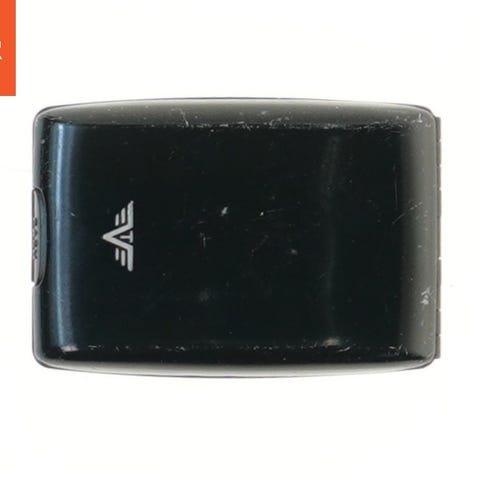 Et sort Tru Virtu kortetui, kompakt designet til opbevaring af kreditkort og lignende. Etuiet kan åbnes og har en metalclips til sikker fastholdelse af kort. Logoet 'Tru Virtu Oyster' er synligt indvendigt.