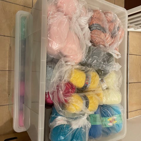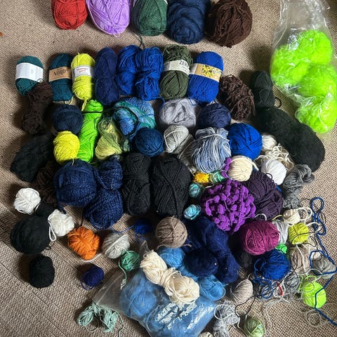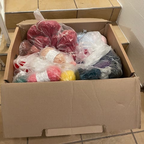 Blandet garn pakke med primært akrylgarn i forskellige farver. Garnet ligger i bundter og poser med flere nøgler i hver. Velegnet til strik og hækling af fx tilbehør, tæpper og andre hobbyprojekter, hvor der ønskes mange forskellige farver og typer garn. Ingen specifik mærkeangivelse, der er tale om en assorteret samling af garn.
