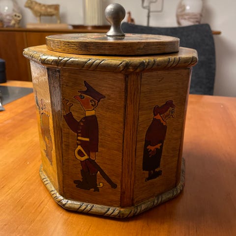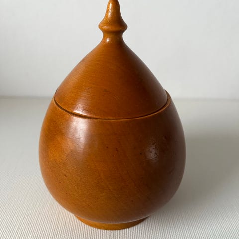 Den er lavet med striber, måske er den sammensat af forskelligt træ.