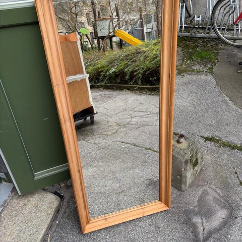 Gammelt retro IKEA spejl med ramme i massiv fyrretræ. Fra 1970’erne. Mærket Morava.