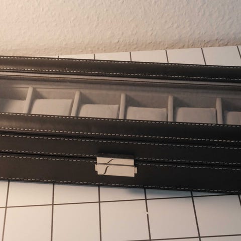 Ur boksen er udenpå som ny. De eneste synlige brugsspor er, at man kan se, at der har siddet ure på nogle af de brune velour puder.
