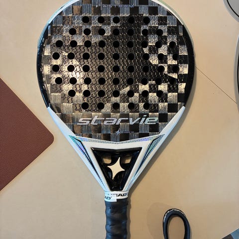 Starvie Aquila padelbat i sort og grøn. Rund/let dråbeformet hoved med perforeret slagflade og hvidt stjernedesign. Håndtag med hvidt greb og håndledsstrop. Velegnet til padelspillere, der ønsker en bat med kombination af kontrol og kraft. Yderligere specifikationer som vægt og balance fremgår ikke af annoncen.