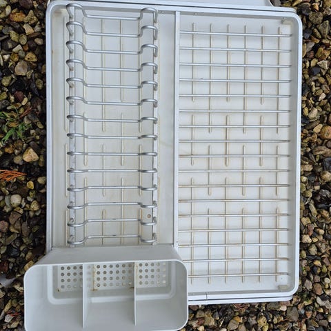 Dette er et metal opvaskestativ, designet til at organisere og adskille tallerkener under tørring efter vask. Stativet har en størrelse på 48x30 cm og består af fem sektioner for optimal opbevaring. Det er lavet af robust metaltråd, som sikrer stabilitet og holdbarhed.