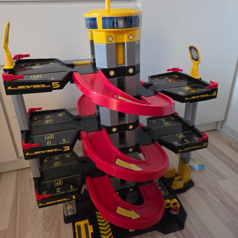 Dette er et bilparkingsæt lavet af stærkt plastmateriale i primært blå, gul og rød farver. Sættet består af flere etager med ramper til små biler, der gør det muligt for børn at simulere en parkeringsgarage. Der følger flere legesagerbiler med, herunder grønne, blå og røde biler, som kan placeres på de forskellige parkeringsmøder og ramper. Sættet har en størrelse på 55x37 cm og giver en sjov og interaktiv mulighed for bilrelateret leg.