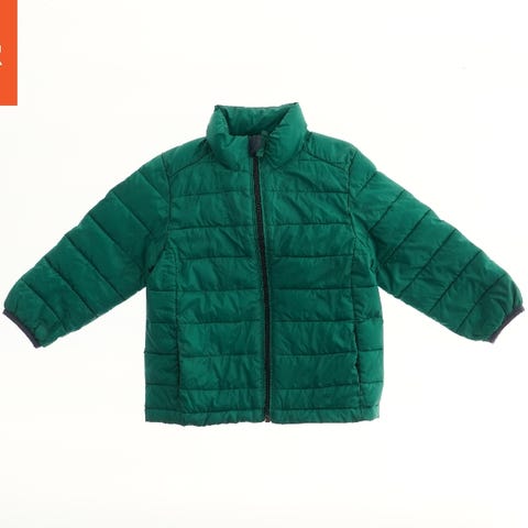 Jakken er blå med quiltet mønster og lynlåslukning foran. Den har elastiske manchetter og en refleksstribe på ærmerne for øget synlighed. Der er også to lommer foran.