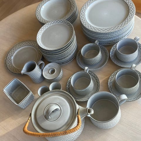 10 kopper. Tre skåle. Fire kuvert askebæger.toiv kagetallerken. Femten underkopper. En kaffekande. flødekande og sukkerskål. Otte spise tallerken. Min dybe tallerkner. To fade og sovseskål .