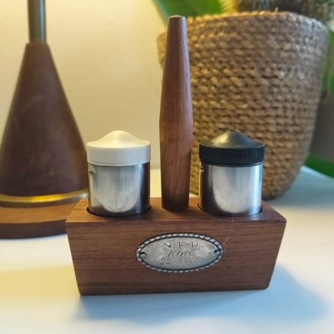 Dette er et retro / vintage sæt bestående af en salt- og en peberbøsse, begge lavet af teak træ. De har en konisk form og måler 7,5 cm i højden. Saltbøssen har en lys trætop, mens peberbøssen har en sort top, hvilket gør dem nemme at skelne fra hinanden. Bunden af begge bøtter viser tegn på tidligere mærkningsetiketter.