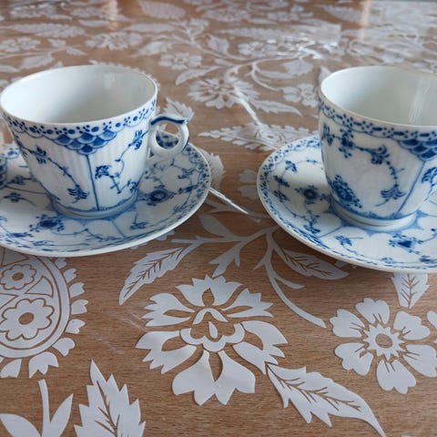 Smukke gamle halvblonde kaffekopper med underkopper.