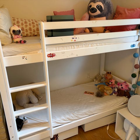 Hoppekids køjeseng til børn i hvidmalet træ. Sengen har to liggepladser med lamelbund på både øverste og nederste plan. Der er fastmonteret stige i siden samt sengeheste på øverste køje for ekstra sikkerhed. Velegnet til børneværelse, hvor der er behov for to sovepladser på begrænset plads.