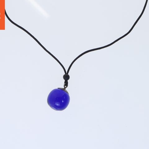 Dette er et armbånd med en diameter på 10,5 cm. Armbåndet har en brun flettet snor og en stor blå glaskugle som hoveddekoration. Der er også små sølvfarvede metaldetaljer ved siden af glaskuglen. Armbåndet er justerbart og kan justeres med en trækknude. Det leveres i en sort æske.