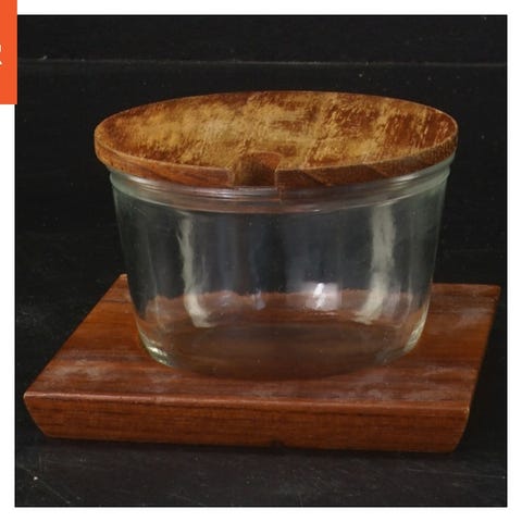 Dette er en Teak træ skål med glasindsats med glas låg. Glasskålen og træbasen passer sammen og fungerer som en opbevaringsenhed til ost, smør eller andre lignende varer. Størrelsen på objektet er Ø 18x10 cm. Tags: ost, låg, opbevaring, teak, træ, glas.