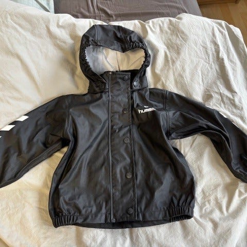 Sort regnjakke fra Hummel med en hætte og justerbare snore i bunden. Jakken har et stort Hummel-logo på ryggen og en mindre variant på brystet. Ærmerne har et mønster af hvide vinkler, typisk for Hummel-stilen.