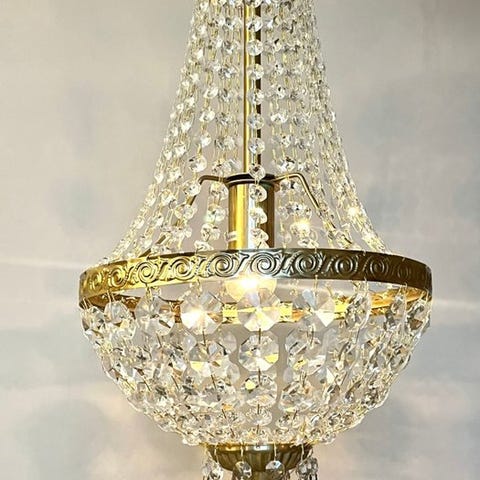 Del til en krystal lysekrone. Produktet inkluderer en cylindrisk sektion med flere krystaldetaljer, påført på en metalbase med tilslutninger, samt løse krystal stykker og skruer. Størrelse: 20x15 cm. Tags: krystal, lysekrone