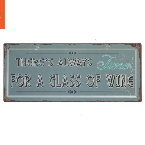 Dette er et rektangulært metalskilt med målene 30,5x13 cm. Det er designet med teksten 'There's always time for a glass of wine' trykt på forsiden. Skiltet har en vintage-stil med let slid og rustik finish, hvilket tilføjer charme til dets udseende. Bagsiden er ensfarvet og har monteringshuller til ophængning.