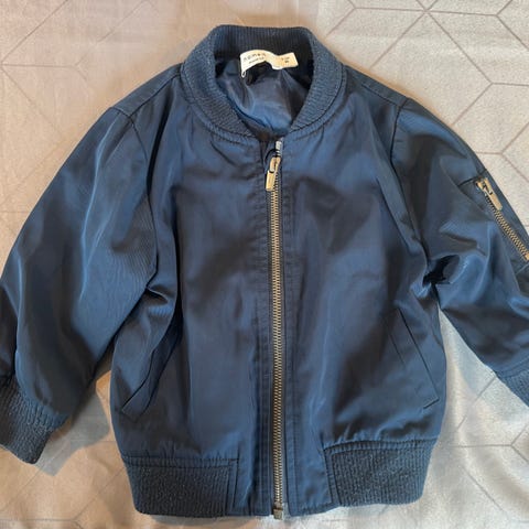 Let foret bomberjakke med ribkant i kraven, ærmerne og nederst på jakken. Den lukkes med en lynlås foran og har to sidelommer med knaplukning. Jakken er olivengrøn med en kontrastfarvet orange foring.