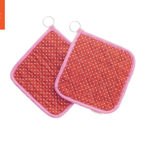 Sættet indeholder to kvadratiske grydelapper og en ovnhandske. Grydelapperne har en blomstret design i lyserød og lilla nuancer. Ovnhandsken er dekoreret med mariehøne-motiver. Begge dele er quiltet for ekstra beskyttelse og kommer med praktiske stropper til ophæng.