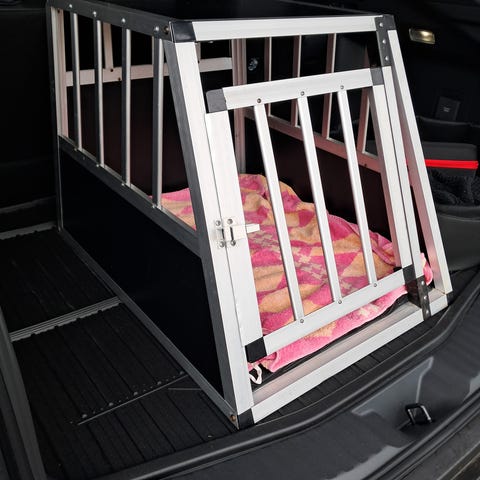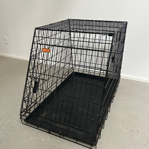 Hundebur i aluminium i farverne sort og sølv. Buret har gitter i sider og front og delvis bagpå. Egnet til transport.