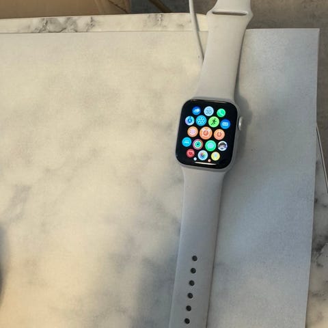 Appel Watch i sølv. Brugt få gange. Rigtig god stand. Virker som det skal. Silikone-remmen kan udskiftes og justeres. Der forfølger en oplader med i købet. Skærmen har få ridser men som billederne viser ingen synlige skader eller noget man bemærker