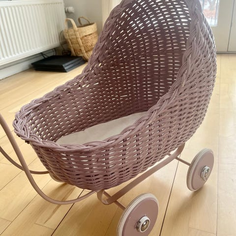 krea dukkevogn i rød farve. Vognen har hvidt metalhåndtag og fire hjul med lyse dæk. Indvendigt ses sengetøj med Cirkeline -motiv. Egnet til leg med dukker og bamser i børneværelset eller indendørs leg. Materiale primært træ og metal med malet overflade.