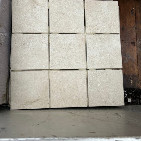 Kvadratiske lysgrå/hvide fliser 33x33 cm egnet til gulv eller væg. Fliserne fremstår ensartede i størrelse og farve med lys overflade. Kan anvendes til eksempelvis badeværelse, køkken eller andre rum, hvor der ønskes en lys og neutral flade.