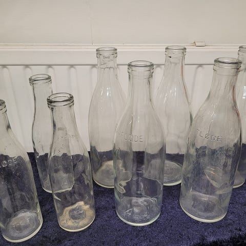Glas, Flasker, Mælkeflasker. 1 stk. 1/10 l, 3 stk. 1/2 l,6 stk. 1/1 l.