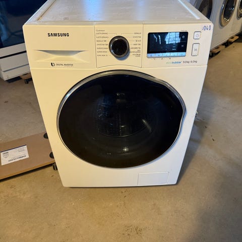 Samsung kombineret vask/tørring vaskemaskine i frontbetjent design. Maskinen har stor rund luge foran og separat sæbeskuffe øverst til venstre. Egnet til husholdningsbrug, hvor både vask og tørring ønskes samlet i én maskine. Maskinen har elektronisk betjening på fronten og er beregnet til installation som fritstående eller under bordplade, afhængigt af mål og pladsforhold. Farven fremstår som mørk/grå metallic. Velegnet til almindelig tøjvask og tørring i hjemmet.