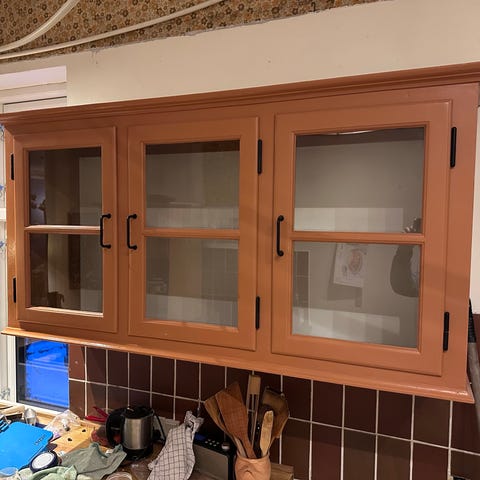 Vi har i vores gamle snedkerkøkken to vitrineskabe som vi gerne vil sælge. Her er det ene af dem.