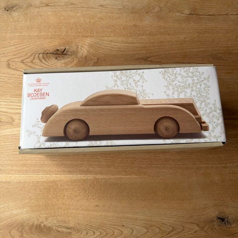 Kay Bojesen Sedan træbil i eg. Klassisk legetøjsbil udført i lyst egetræ med drejelige hjul. Bilen har et enkelt, afrundet design og er velegnet som legetøj eller som dekorativt objekt i hjemmet. Undersiden er mærket med Kay Bojesen-logo.