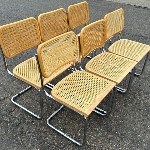Sælger 8 stk. af de ikoniske frisvinger-stole i Marcel Breuer-stil. Stolene har det klassiske stel i forkromet stålrør og rammer i lyst træ med fransk flet. En tidløs designklassiker, der passer perfekt til både spisebordet og kontoret.
