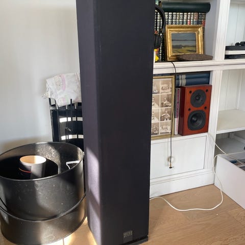 Gulvstående højttaler i sort kabinet. Rektangulært design, egnet til placering på gulv ved siden af møbler eller anlæg. Velegnet som gedigent stereoanlæg.