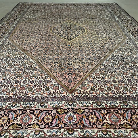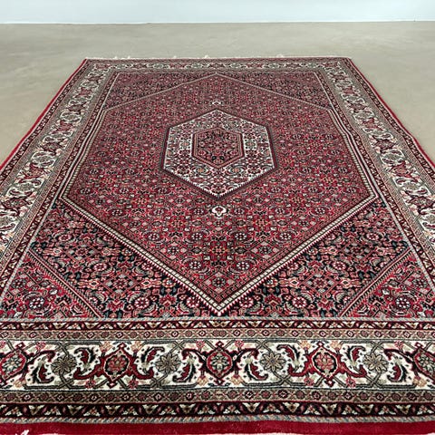 Smukt og klassisk ægte persisk Bidjar tæppe med detaljeret medaljonmønster og rige farver i dyb rød, mørk blå, grøn og creme. Tæppet er håndknyttet i kraftig uld og kendt for Bidjar-kvalitetens tætte og slidstærke struktur – ofte omtalt som “jern-tæpperne” blandt persiske tæpper.