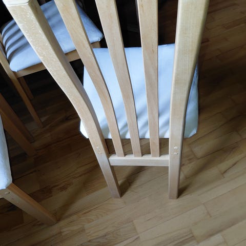6 stk hvidolieret egetræs spisestuestole med ryg/sæde af sort PU. Flot stand