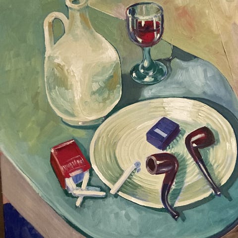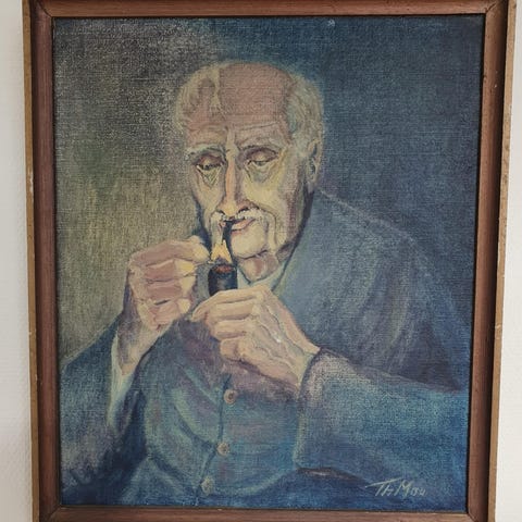 Maleri af mand med pibe. Men en sjov tekst bagpå. Der omhandler hvor billedet kommer fra.