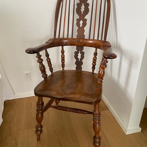 Klassisk windsorstol, “comb-back”-model, dvs. spindelryg med topkam/topskinne, massivt sæde i ét stykke, på svungne ben og med drejede bårer.