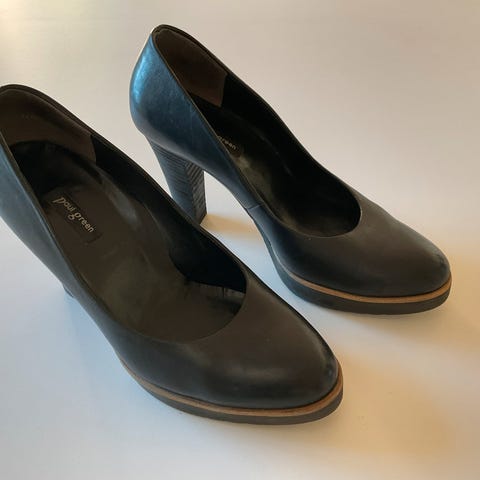 Sorte, højhælede sko størrelse 5,5 svarende til størrelse 39. Paul Green sorte pumps med behagelig pasform. Hælhøjde 9 cm. Ca. 2 cm. sål under forfoden.