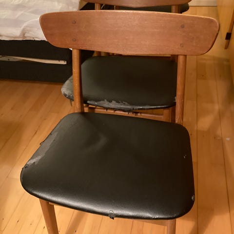 2 stk. klassiske teaktræsstole fra Farstrup Møbelfabrik, som er nyrenoverede med sæder af sort skai. Sælges enkeltvis for 800 kr eller samlet for 1.500 kr.