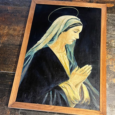 Klassisk italiensk religiøst billede af Madonna på træplade af Filippo Lippi kunstner. Billedet er malet/trykt i smukke klare farver, er indrammet i profileret træramme med gylden overflade og ornamenterede detaljer. Bagsiden fremstår som ubehandlet eller mørkmalet træ.