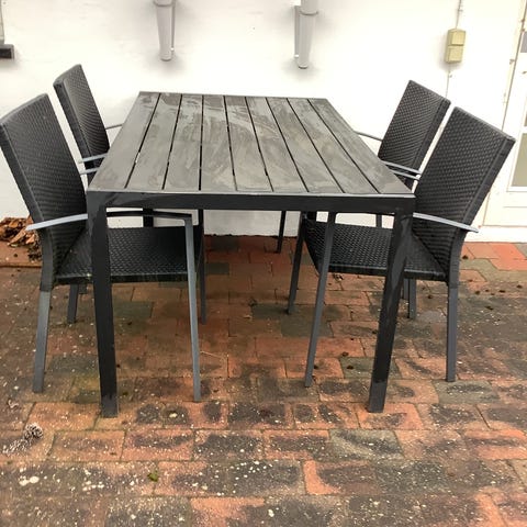 Havebord på lidt over 2 meter og 6 have stole. Købt sidste år i sommers, så lidt over et halvt år gammel.