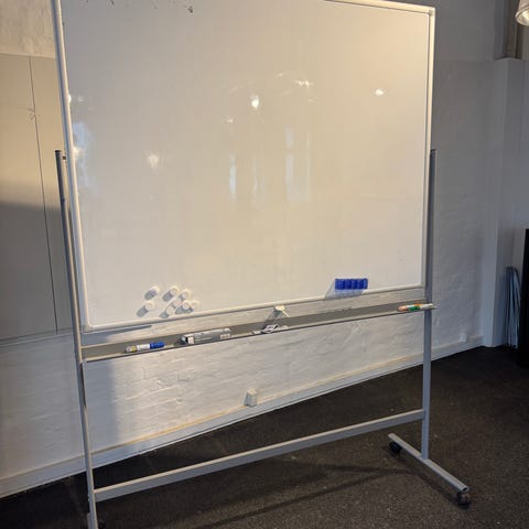 Pænt whitebord med magnetisk hvid skriveflade. Boardet kan hænges op i hjørner, ved brug af skruer.