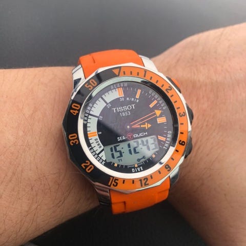 Tissot T-Touch ur til unisex med kombineret analog og digital urskive. Uret har rund stålkasse og sort urskive med tydelige talmarkeringer. Remmen er i gummi/silikone i sort med orange inderside og perforerede detaljer. Betjeningsknapperne sidder på siden af kassen, og bagkassen er skruet fast med model- og T-Touch-gravering. Egnet som hverdags- og sportsur til både mænd og kvinder.