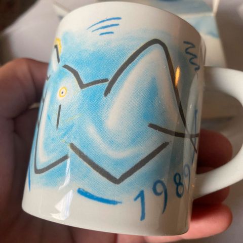 Royal Copenhagen 200 års-jubilæumsbæger/-krus. Hvidt porcelæn med blå dekoration. Bægeret har firkantet, afrundet form og motiv med krone, bølger og årstallene 1775–1975 på siderne.