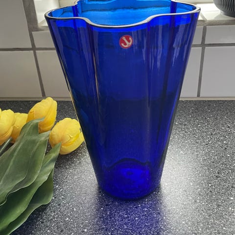 Vase Anker Iversen (AI) blå / turlipan vase, ca. mål: H19, Ø17 cm. Den har kun stået til pynt og er som ny. Fra et røg- og dyrefrit hjem.