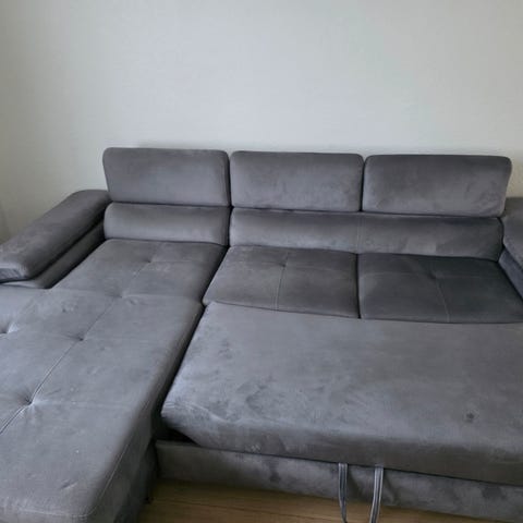 Vi sælger vores komfortable og stilrene hjørnesofa fra IKEA i mørkegråt stof. Sofaen har chaiselong, og også kan trækkes ud som sovesofa.