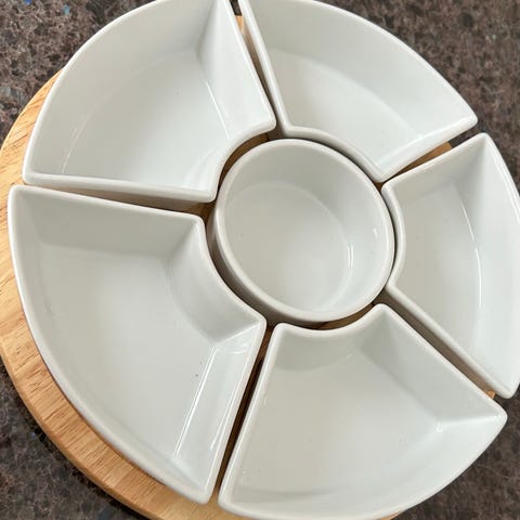 30cm i diameter. Hvidt serveringsfad med 5 små skåle på træplade som kan dreje.